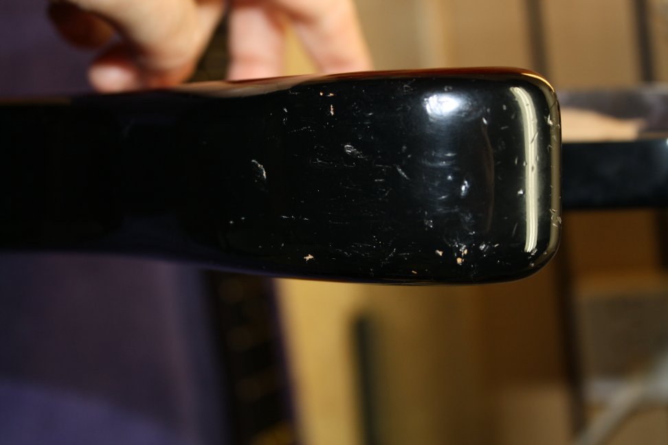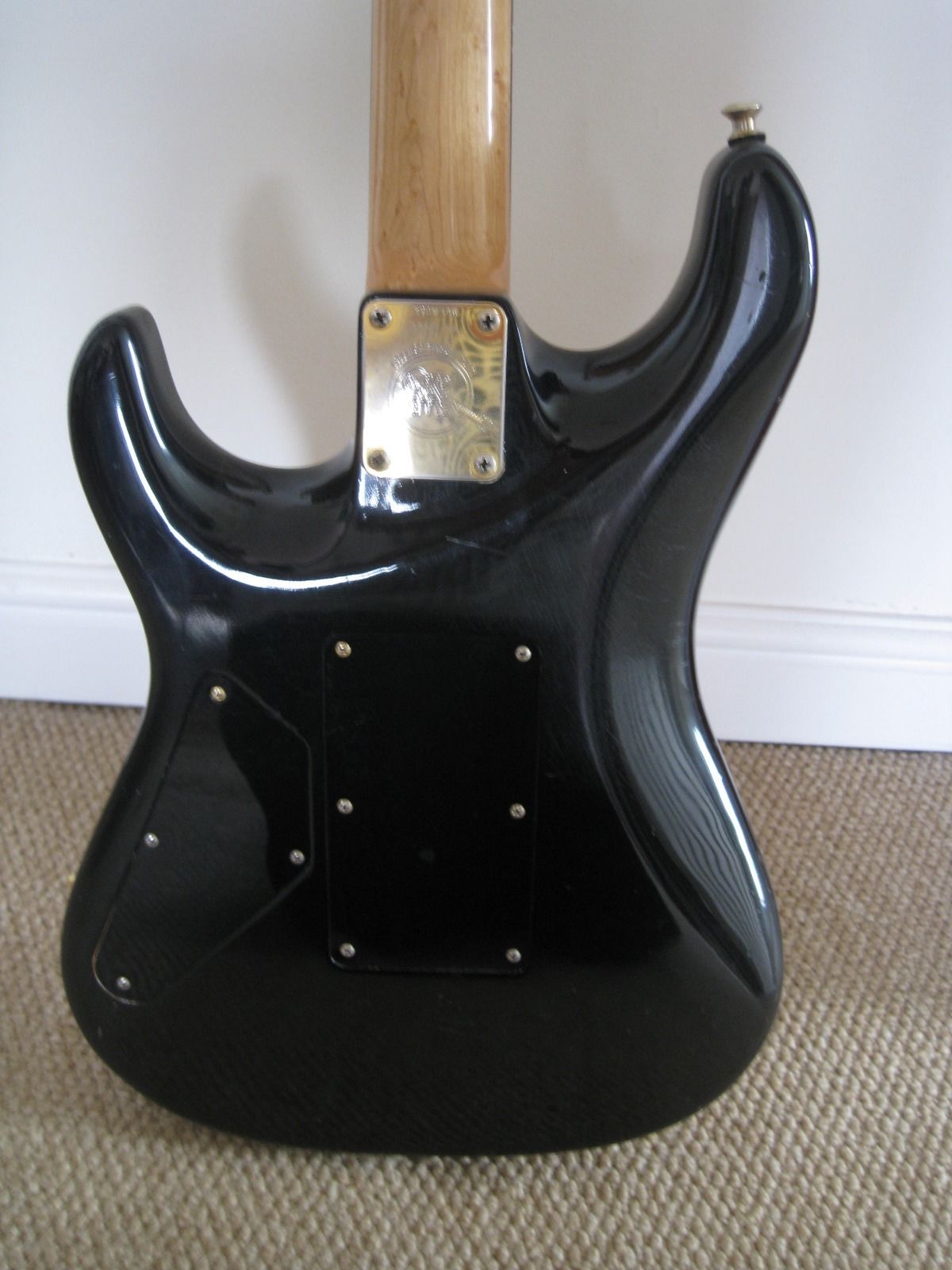 7/8 basswood body, bent S Quilted maple top, vintage burst finish, Floyd Rose, ebony fretboard, birds eye maple neck, SLV/SLV/85 EMG pickups. All gold hardware.