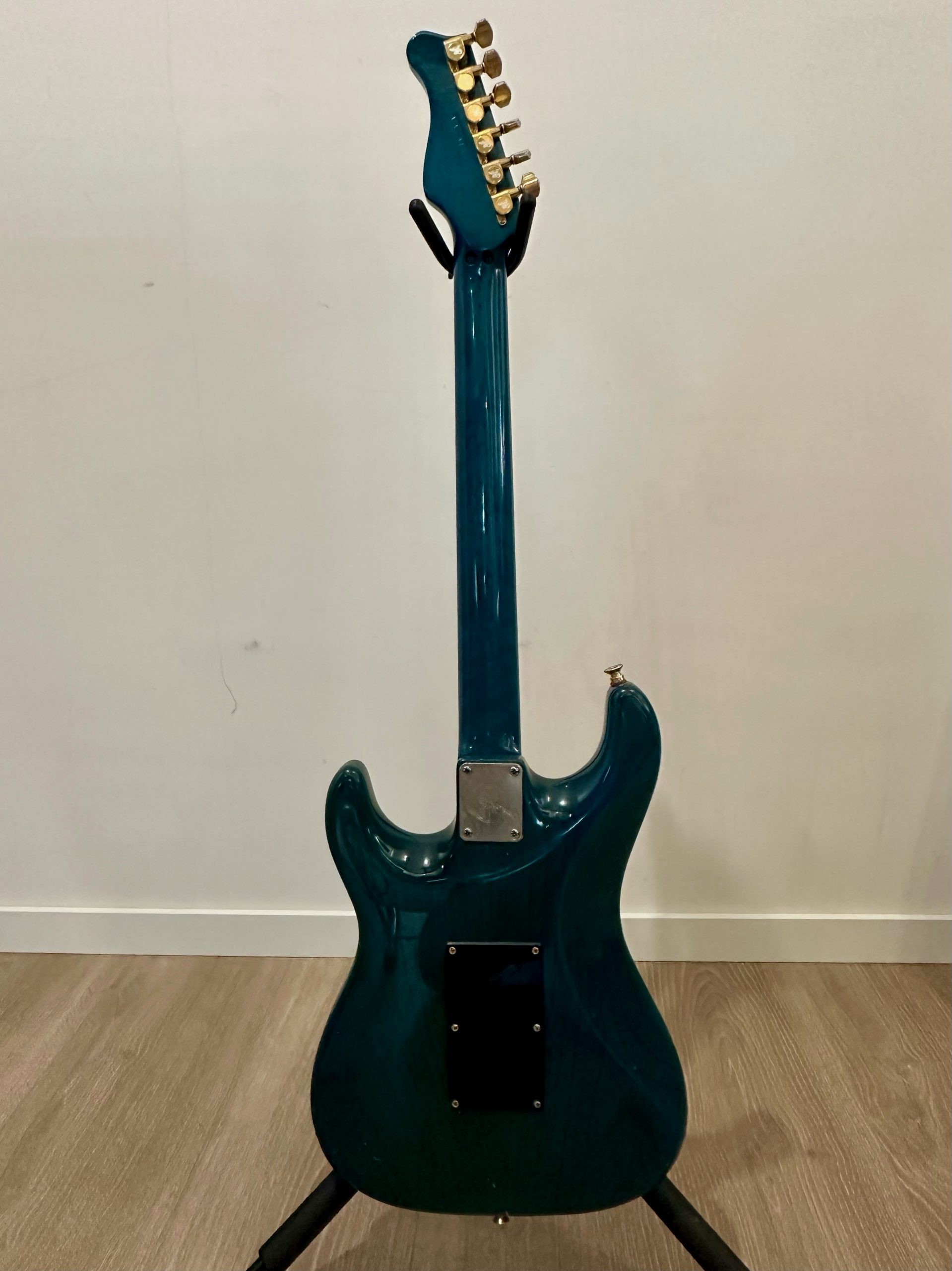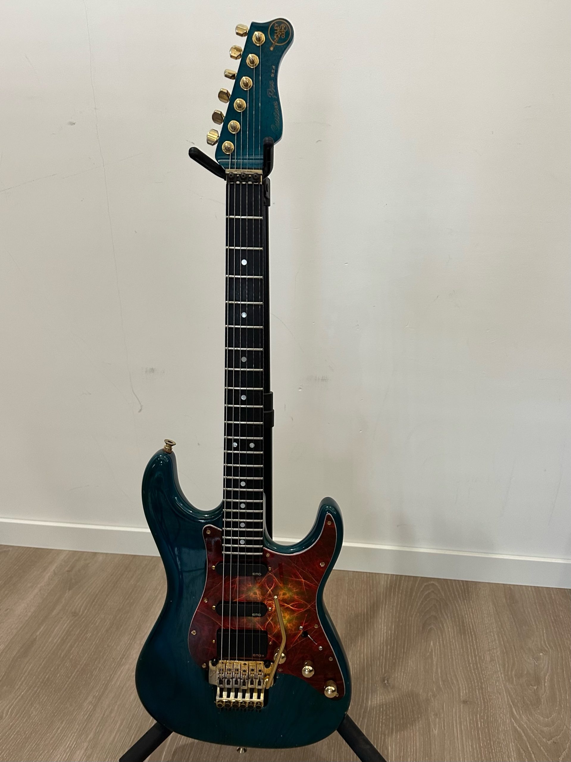EMG SLV set, Custom made pick guard. I believe this one came from Japan when I bought it. I’ve toured with the guitar around the world many times. I’m the MD and guitarist of David Garrett