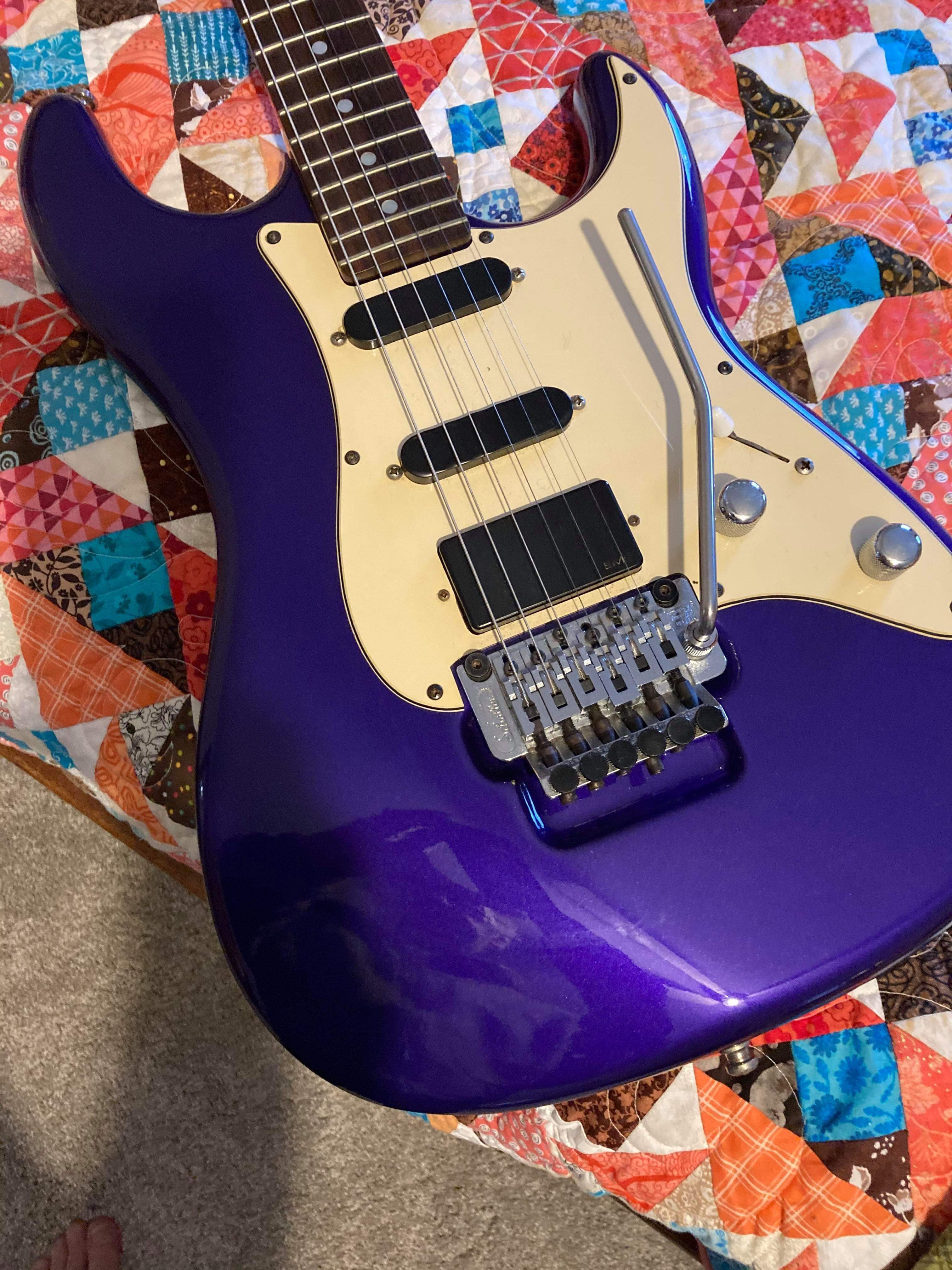 Purple, chrome hardware, original natural headstock, black EMG's. 1989